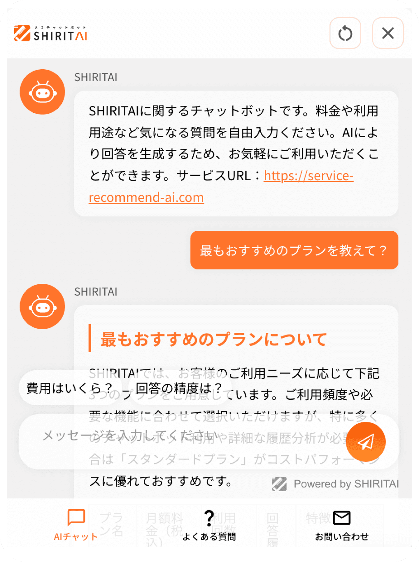 SHIRITAIは、企業情報、商品情報をもとにAIがリアルタイムで質問に答えます。お問い合わせ対応、リード獲得、商品レコメンドなど、あらゆる用途に活躍するAIです。