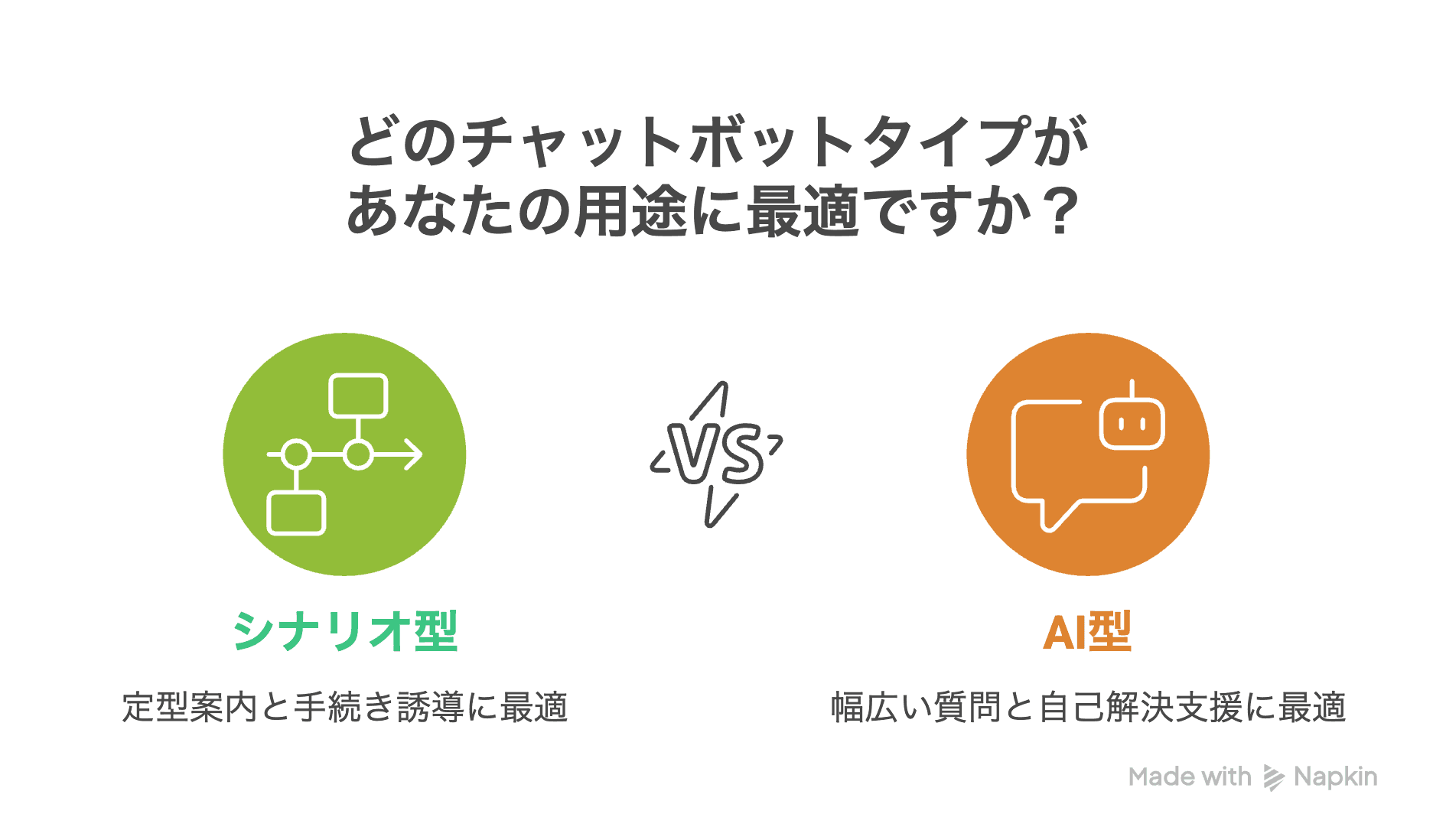手続き・申請・確認など、抜け漏れなく案内したい → シナリオ型が強い製品・サービスの相談など、質問が多様で曖昧さがある → AI型が強い
